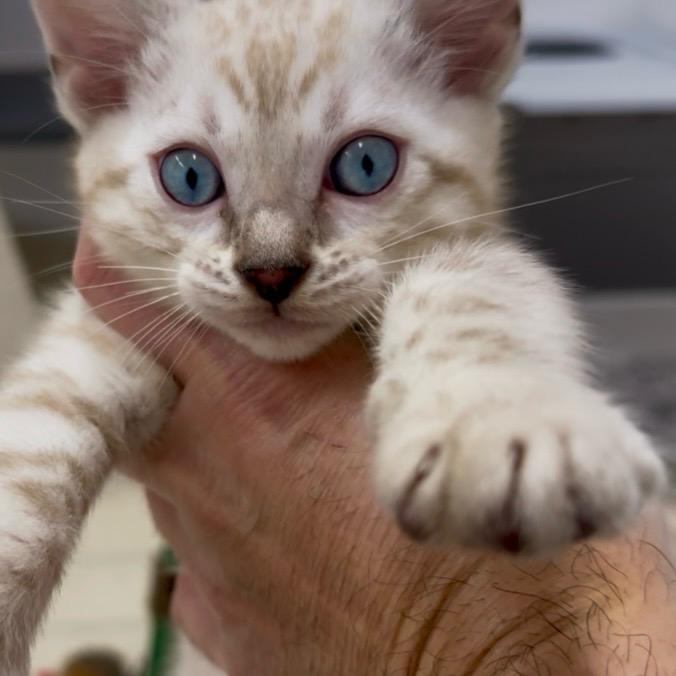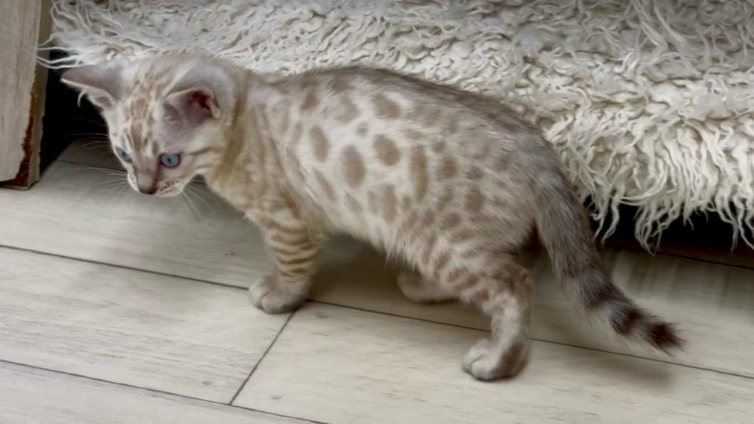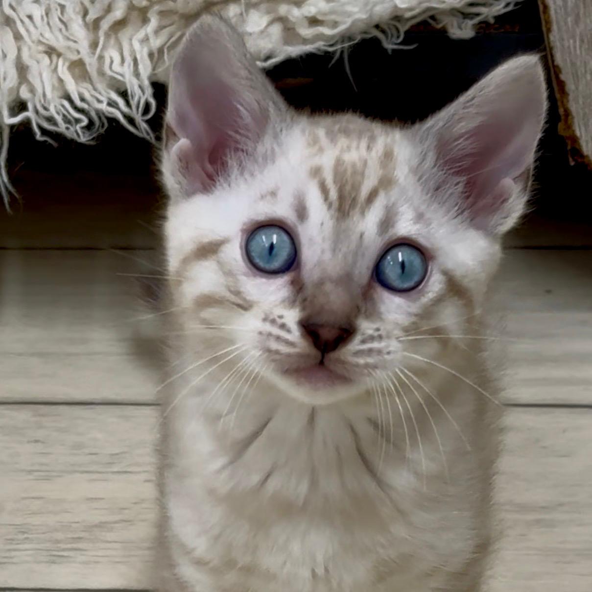 Vincent is an exceptional Snow Lynx Bengal kitten with the most enchanting blue eyes. His beautifully crisp markings are perfectly contrasted against a soft, creamy off-white coat, enhanced by a delicate pearlescent glow created by his exquisite glittered fur.