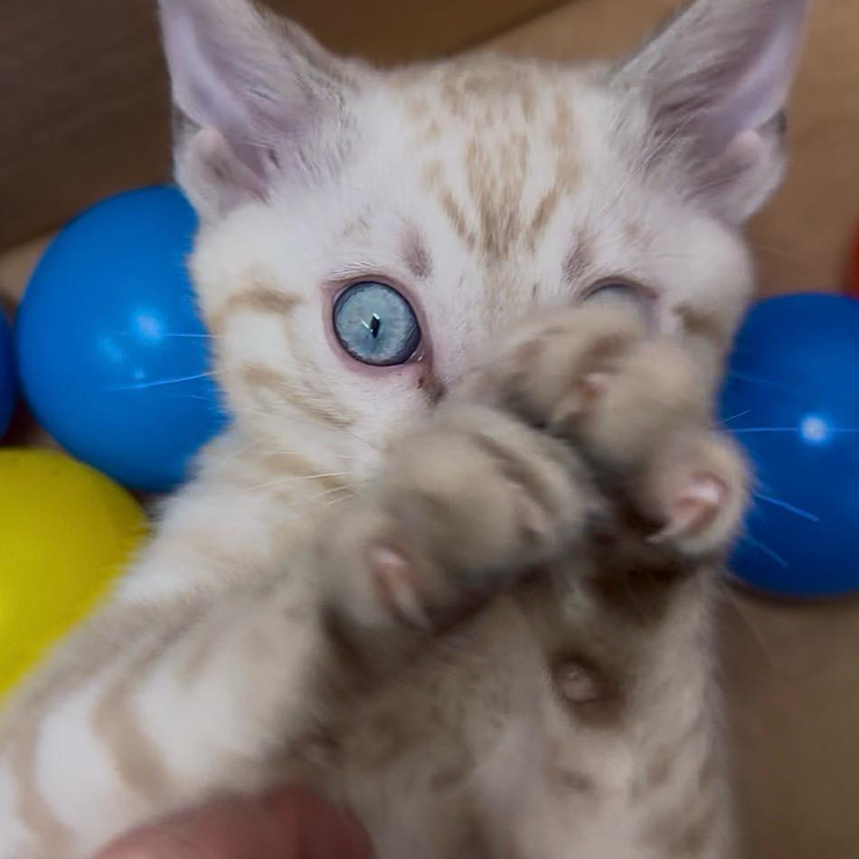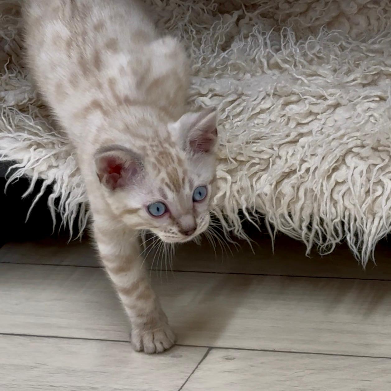 Vincent is an exceptional Snow Lynx Bengal kitten with the most enchanting blue eyes. His beautifully crisp markings are perfectly contrasted against a soft, creamy off-white coat, enhanced by a delicate pearlescent glow created by his exquisite glittered fur.