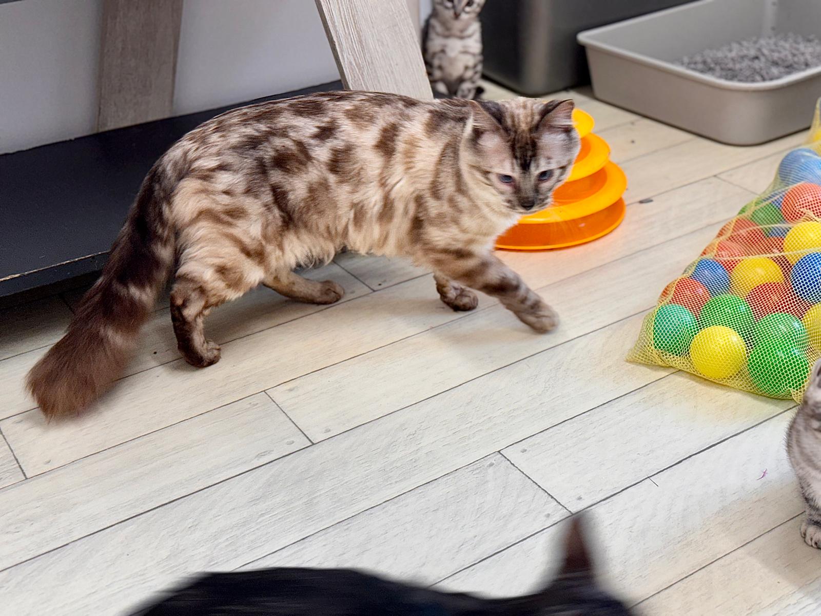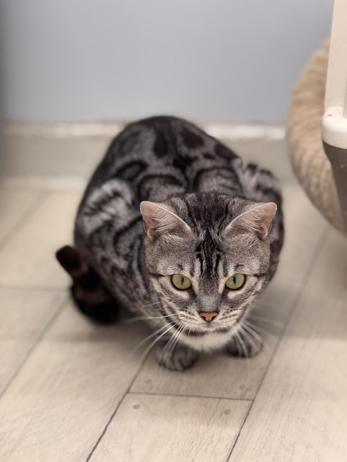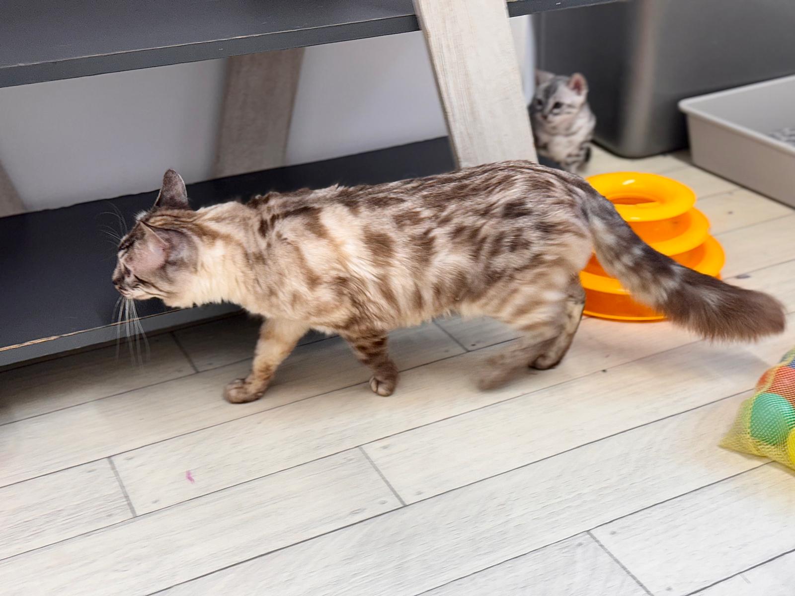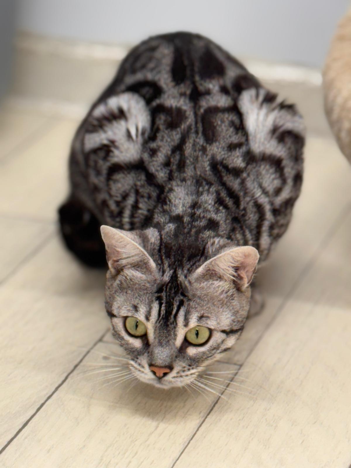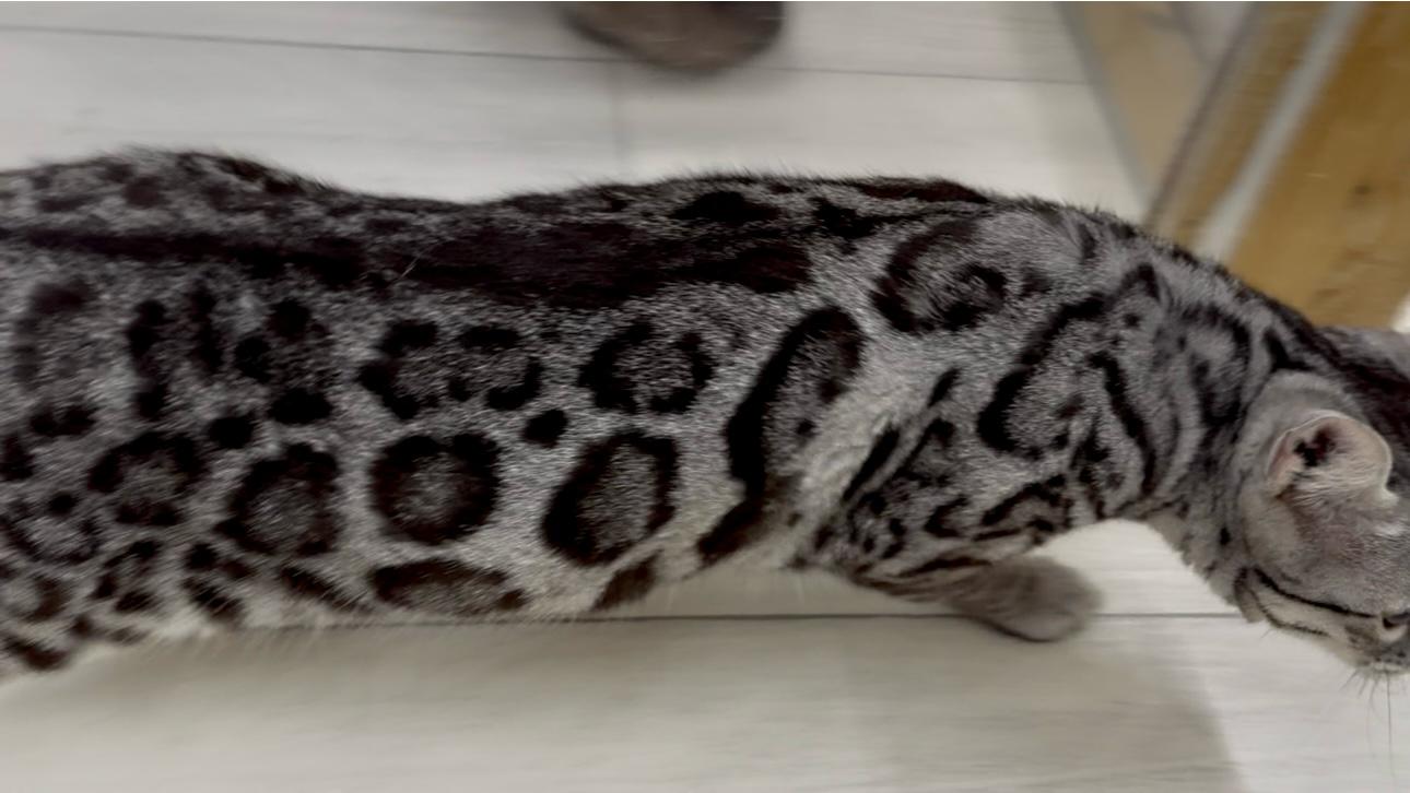 Introducing Jasper, our big, chunky, and incredibly handsome 1-year-old Bengal boy. With his striking snow-leopard markings, glittered coat, and piercing blue eyes, he truly is a showstopper.