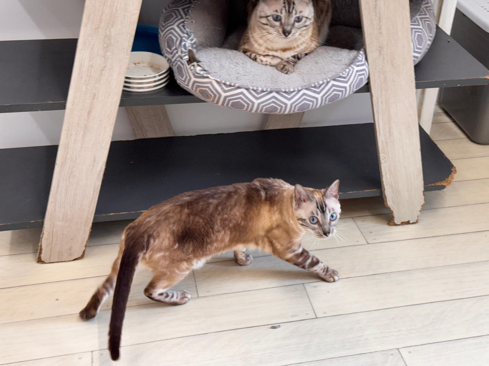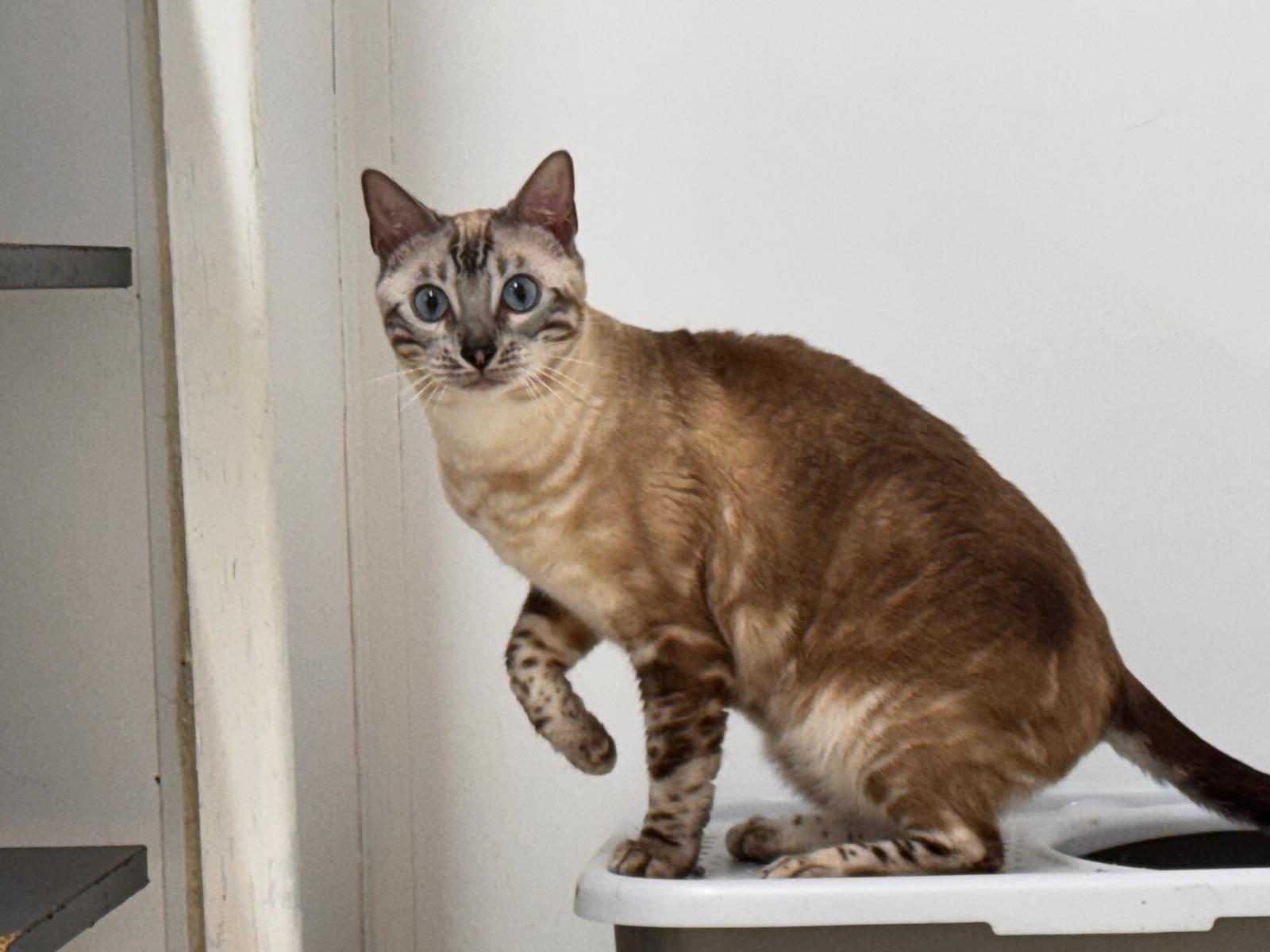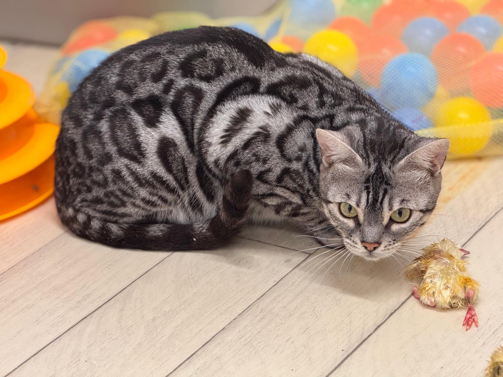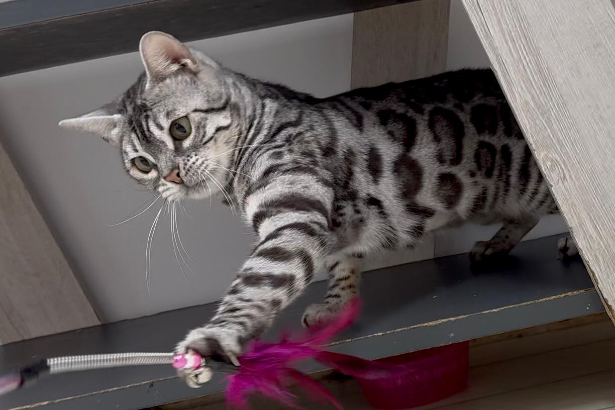Introducing Jasper, our big, chunky, and incredibly handsome 1-year-old Bengal boy. With his striking snow-leopard markings, glittered coat, and piercing blue eyes, he truly is a showstopper.