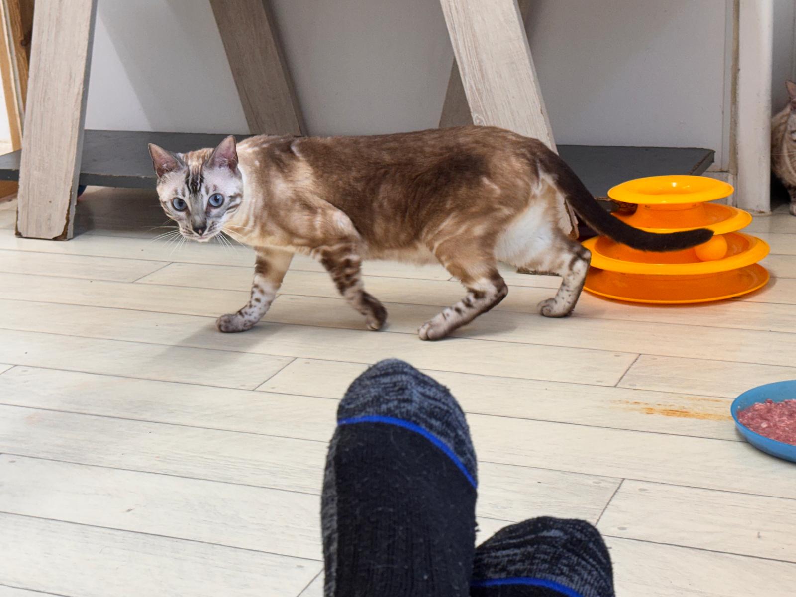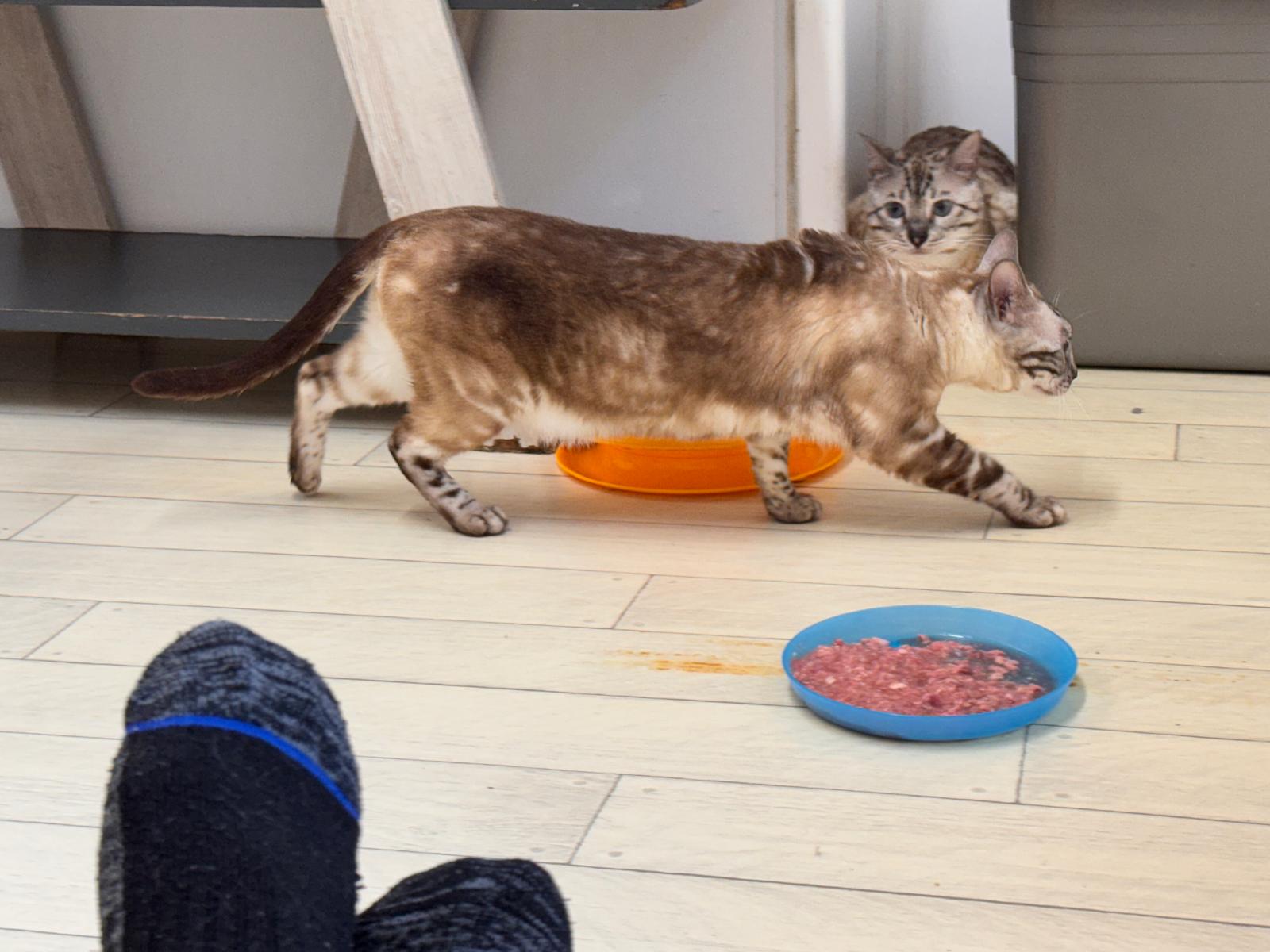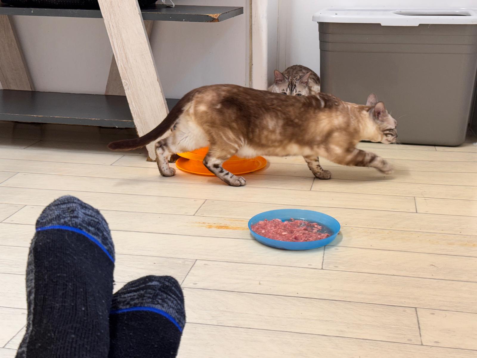 He’s especially fond of food (you’ve been warned!). His favourite treats include thawed day-old chicks and his signature minced chicken mix – a proper gourmet at heart.