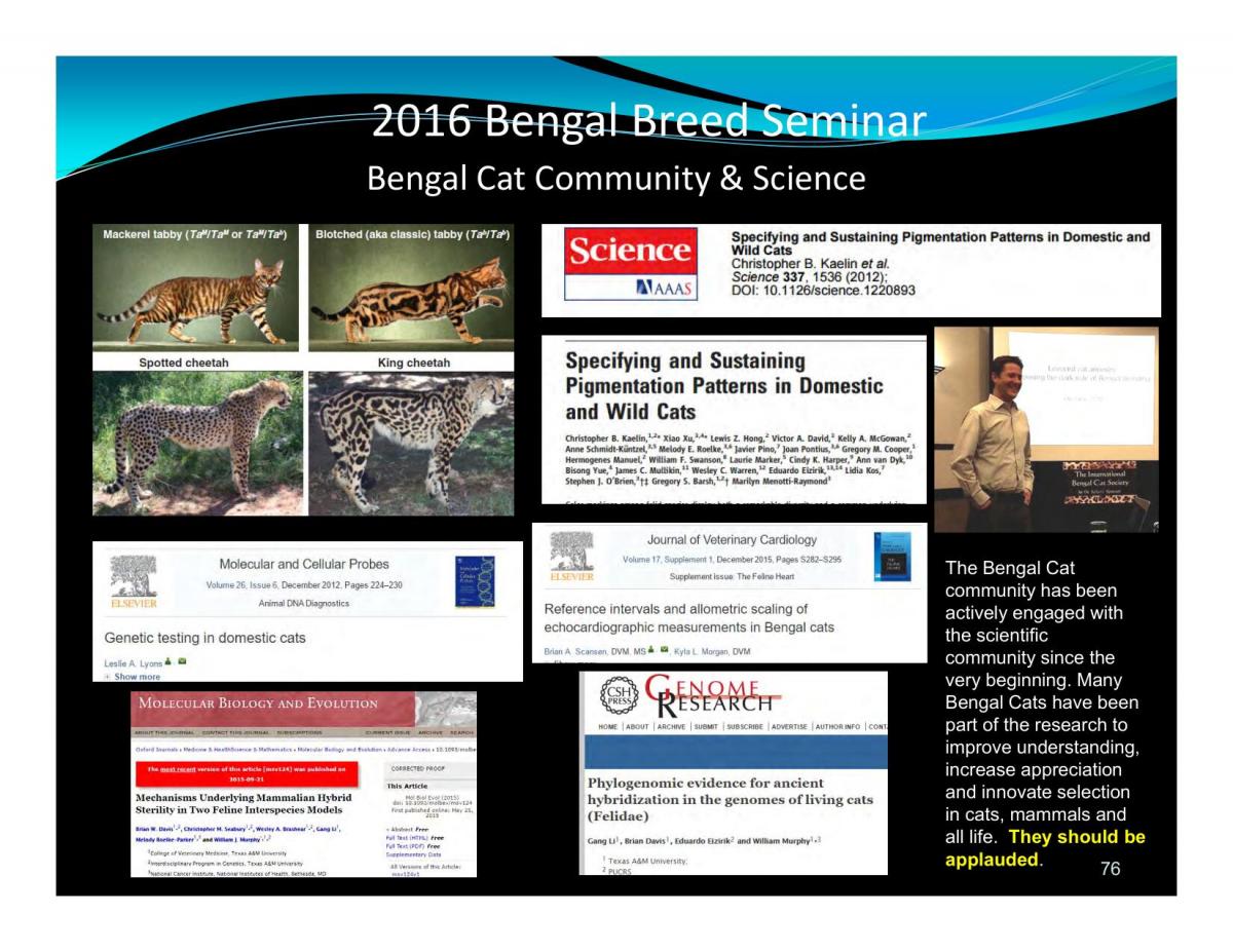The Bengal Cat community has been actively engaged with the scientific community since the very beginning. Many Bengal Cats have been part of the research to improve understanding, increase appreciation and innovate selection in cats, mammals and all life. They should be applauded